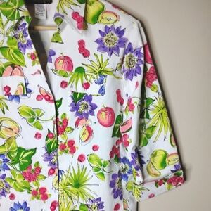 Cheerful 1980s AJ Clothing canvas jacket with a bold fruit & floral print (strawberries, peaches, greenery) and novelty strawberry buttons. Shirt-collar, 3/4 sleeves, straight hem. Lightweight—perfect over tees or sundresses. Made in USA.