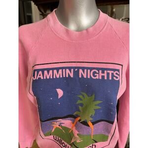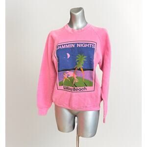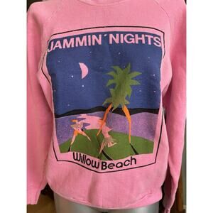 Retro vibes all around — this vintage VERY pink “Jammin’ Nights” Willow Beach sweatshirt it straight out of the 80s/90s. Made in the USA on a classic Fruit of the Loom tag with soft fleece inside and a bold graphic featuring palm trees and sunset colors.