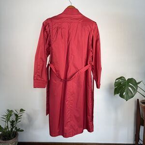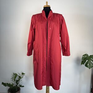 Lightweight full-length vintage raincoat by J. Gallery, made in Taiwan. Red nylon shell with a removable quilted liner for added warmth. Button front, roomy fit, and classic 80s structure. Label size Petite 13/14. Great for everyday wear, travel, or layering in transitional weather.