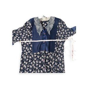 A vintage floral maxi dress featuring intricate lace detailing, ruffle sleeves, and a comfortable polyester blend fabric in navy tones.