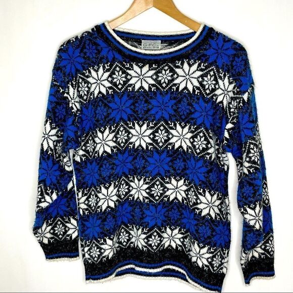 Cozy, retro 80’s vintage GFC Snowflake Sweater featuring a bold Fair Isle pattern in blue, white, and black.