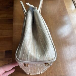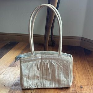 Vintage 80s Genuine Eel Skin Leather Top Handle Shoulder Bag. Gorgeous vintage eel leather bag. Its sleek design and neutral color make it a versatile addition to your wardrobe. So classy. The leather is butter soft. Suede lining with a center zipper pocket separating 2 compartments to keep you organized. Footed base. Great vintage condition with some marks and a small area of separation on the handle. Such a beautiful way to add interest and texture to your outfit!