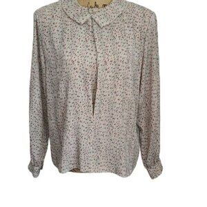 DETAILS: All over geometric print shirt with Peter Pan collar and keyhole back opening with long button sleeves.