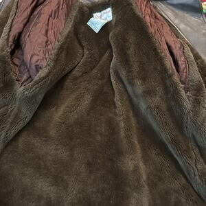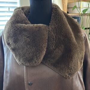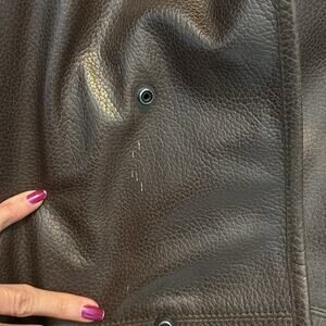 Brown leather. Faux fur lining. Snap up. Adjustable wrist cuffs. Pockets. Size medium. Some marks on front of coat next to one of the snaps - see pic. In otherwise very nice used vintage condition - no rips, tears, or stains. Flat lay measurements are approximate.