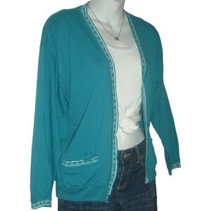 Vintage 80's Gina Peters Turquoise Varsity Cardigan Embroidered Flower Cardi M