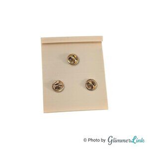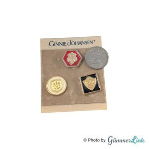 Vintage Ginnie Johansen gold tone enamel pin set featuring a geometric heraldic theme.