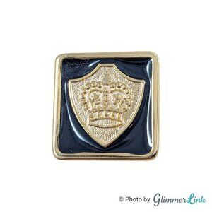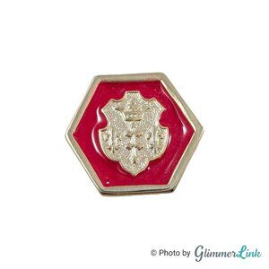 The set includes an hexagonal red enamel pin with a crest, crown and fleur de lis symbols. It also includes a round cream enamel pin with a shield and fleur de lis symbol. The third pin in the set is square accented with black enamel and displaying a shield and crown symbols.