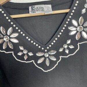 This is a vintage bodysuit from the 1980s, made in Hong Kong. It's a black, one-piece garment with a v-neckline and three-quarter length sleeves. The neckline and shoulders are adorned with a beautiful, bejeweled design featuring silver-toned rhinestones and sequins. The bodysuit has a snap closure at the crotch.