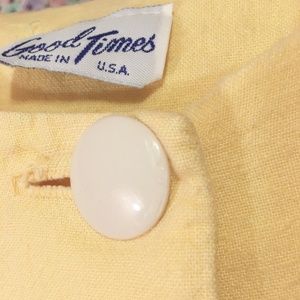 Vintage 80s yellow button up top with white bows & big white buttons. The shoulders have a crinoline ruffle to give the appearance of shoulder pads. It is in worn condition. There is a hole on the back collar. The buttons have scuff marks on them. It has a black mark on one sleeve which I think may be eyeliner? I tried to remove the mark but it only faded it a little. The fabric is threadbare so I'm selling for a low price.