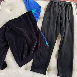 Vintage 80s Goolagong soft and cozy velour two-piece outfit that could be worn together or as separates. The top is crewneck and black with large geometric shape, graphic across the front in cobalt, blue, teal and golden yellow. The pants do not have pockets and are pull on with a stretchy elastic waist. Both are tag size medium, but please note measurements. The pants are 15 inches straight across the waist when relaxed. Straight leg with a 29 inch inseam. The top has approximately 23 inches shoulder to hem and 21 inches armpit to armpit