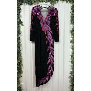 Striking 80s vintage gown, intricately adorned with sequins and beads in a mesmerizing display. This show-stopping dress features a plunging V-neckline with sheer mesh, long sleeves, and a unique asymmetrical hemline that gracefully cascades to the floor. The black backdrop accentuates the vibrant pink and purple sequin embellishments, creating a captivating floral or leaf-like pattern that flows down the front. Ideal for a black-tie gala, a glamorous evening event, or a vintage-themed party where you want to make a statement.