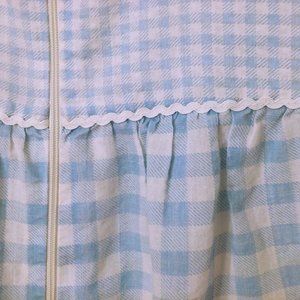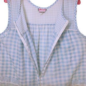 Vintage 80s Dressing Robe, Granada made in USA, Gingham Check with Ric-Rack trim, Cottage Prairie Country Farm House Dress, ladies- Medium/large, Pockets, sleeveless, Zip-Front, gently worn thin soft feather-weight easy care unknown Cotton/poly? fabric in shades of pastel blue white. In pre-owned* condition with no outwardly visible flaws - couple random white dots - care tag unreadable - worn translucent - see pics. Sun Dress, Day Dress, Casual Dress, Country Cottage, Loungewear, Leisure Dress, Prairie Garden, House Dress, Hostess Cabana, Pool Patio, Summer, Throw-on After Shower, Morning Coffee Mail Dishes Chore,