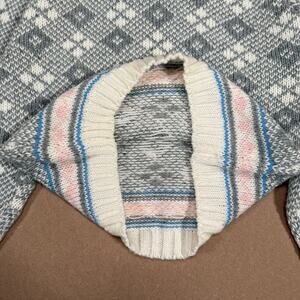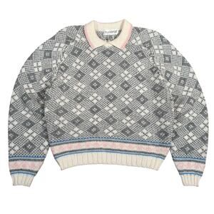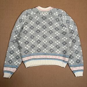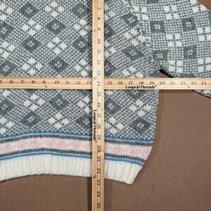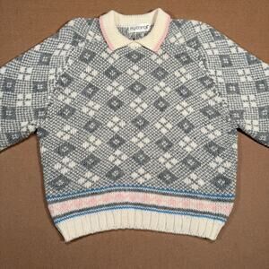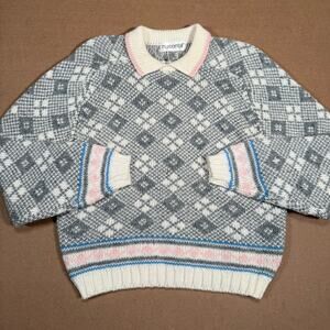 Vintage 80s Grandma Collared Sweater L Gray White Argyle Knit Pink Pastel Trim