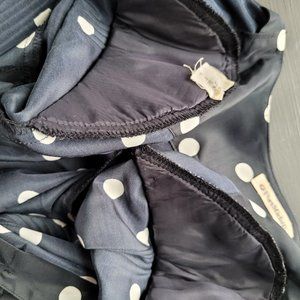 Beautiful silky black and white polka-dot partial button-down dress in very good vintage condition. It features light power shoulders for a sharp silhouette (shoulder pads are easy to snip out but drop me a comment if you'd like me to do so before shipment), pintuck details down the front of the bodice, front hip pockets, loose bishop sleeves, and pleating up the sides of the bodice. Has belt loops but missing belt; the loops would be easy to snip off.