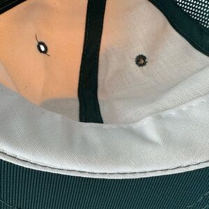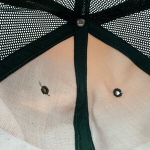 Can’t see any stains around rim, very light if there. Tags faded, small spot on brim, see pic. ***brim of cap seems fragile, I would not recommend trying to bend it