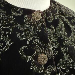 The Vintage 80s Gunne Sax Jacket in size vintage 4 is a unique and stylish piece with a Victorian look. Made from black velvet with silver print embellishments.