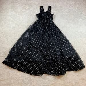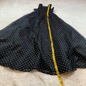 Black and white polka dots with ruffled bust and lace edged crinoline and mesh underskirt. There is a back zipper and corset stays in the bust as well. Straps appear to have been added later, and have excess material. There are gussets added at the sides of the bust to give more room for your girls. They are well done, and look professional.