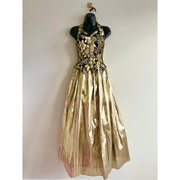 A rare late-80s/early-90s Jessica McClintock Gunne Sax metallic ball gown, dripping in gold and drama. The bodice features a sculpted floral brocade with a halter neckline, peekaboo cutout, and a faceted crystal accent. The skirt is full, luminous, and crinkled metallic gold with black tulle underskirt for volume.