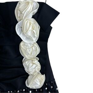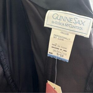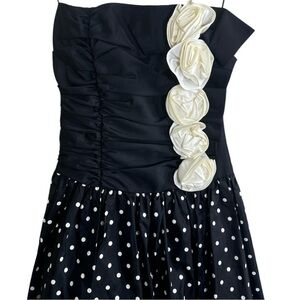 This Gunne Sax by Jessica McClintock strapless evening dress captures every iconic 1980s detail—perfect for collectors or a standout party look. The shirred, boned bodice is trimmed with five dramatic rosettes along the ruffled front edge, while the full skirt features a built-in crinoline and a high-low hem that dips to tea length in the back.
