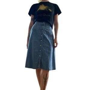 Vintage 80s H.I.S. Denim Blue Jean Midi Skirt. Features pearl snap button front.