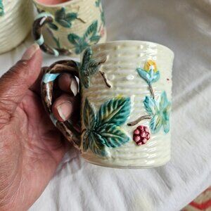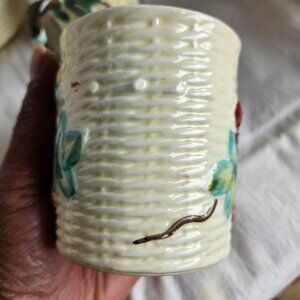 "Vintage 80s Haldon Group "Blackberry" Basketweave Handpainted Pitcher Set. Features embellished pitcher with 2 matching decorative mugs. 1988. Blackberry vine handle. Blackberry leaves, blossoms and berries cover the top.