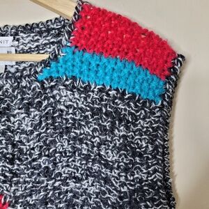 Hand knit abstract pattern — black, red, blue, and marled black/white