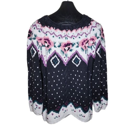 Vintage 80s Hand Knit Crew Neck Sweater Womens L Black Floral Cottage