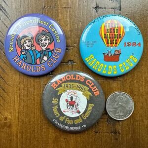 Purple Pin: Features two cartoon characters and the text "Nevada's Friendliest Casino HAROLDS CLUB".