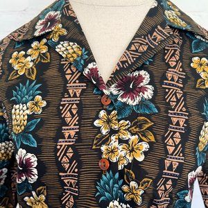80s Hilo Hattie brown tribal floral print collar blouse/shirt