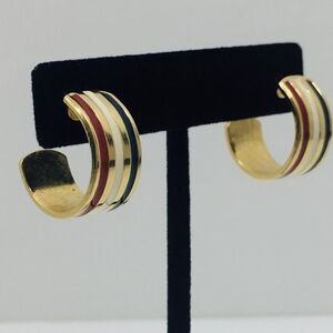Vintage 80s red, white, and blue striped gold tone pierced hoop earrings measure about 1" in diameter