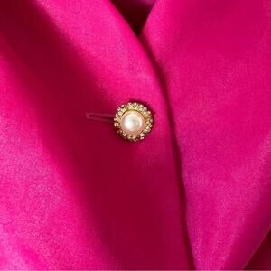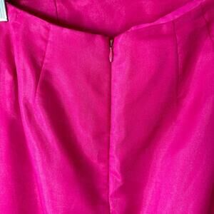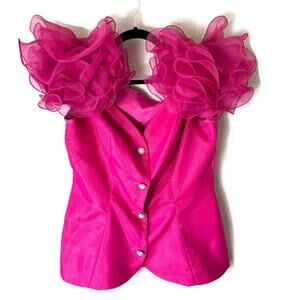 Good used condition! Hot pink Barbie core skirt set. Fitted button up blouse with pearl rhinestone buttons and snap button closure. Large ruffled exaggerated statement sleeves with a matching chiffon a maxi skirt. Zip up closure in back of skirt. One imperfection shown in last photo on side of blouse. An avant-garde look for a special occasion! Please note vintage tag says size 12 however vintage sizing varies from current day and fits more like a size 8.