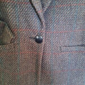 Features 1 faux breast pocket, 2 side pockets, double lining, shoulder pads, single black button for closure, oversized, made in the U.S.A. The colors in the Tweed pattern are maroon, gray, green, and blue. This blazer is sure to make a statement.