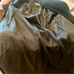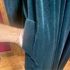 100% Cotton. Elegant, black velvet long coat with cuffs, padded shoulders, clean lining, no rips open style no buttons or zippers, front lined pockets!
