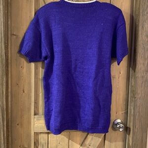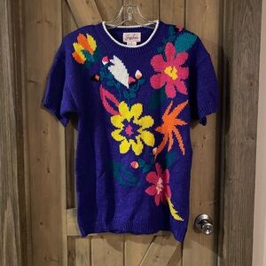 Vintage 80s Jaclyn Smith Purple Art To Wear Flowers Short Sleeve Sweater L