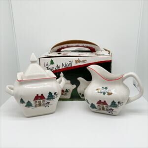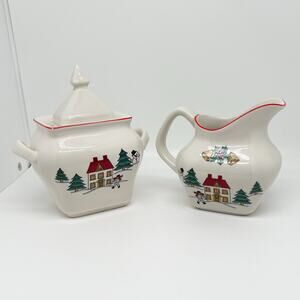 This set is party of The Joy of Christmas collection by Jamestown China, featuring festive holiday designs. It is crafted from stoneware and includes a sugar bowl with a lid and a creamer jug. It was produced in 1989. Comes with original box.