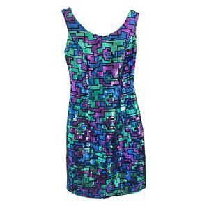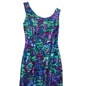 Vintage Jay Reynolds Designs Atlanta Sequin Cocktail Dress – Green, Purple, Blue & Black – Size 3 / 4