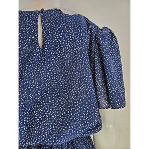 Vintage 80s Jenny navy blue & white polkadot short-sleeved knee-length dress. Has white lace collar, small shoulder pads (could be cut out), flutter sleeves, elastic waistband, and keyhole button closure in back.