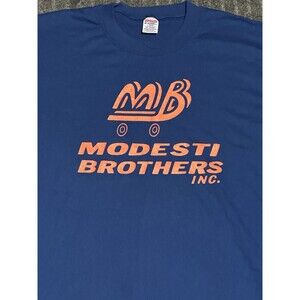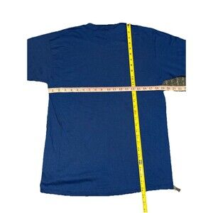 The product is a vintage 80s Jerzees by Russell T-shirt in size large, made in the USA. This original blue graphic tee is made of cotton and has a sportswear/beach look. The unisex shirt features short sleeves and is perfect for those looking for a retro 80s style with a piece of Americana history.