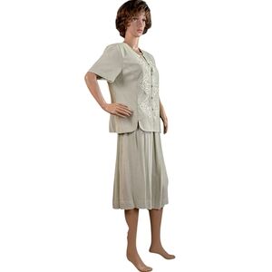 The short sleeved jacket has inner buttons as well as fabric covered button/hoop closure up the front. It has 80s shoulder pads that can be easily removed.
