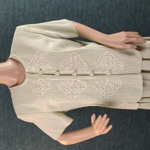 It is a pale green, checked pattern, with soutache-like accents on each side of the buttons up the front of jacket.