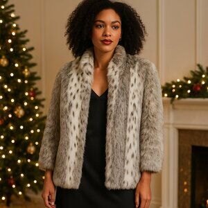 vintage Jordache, faux fur coat, 80s glam, snow leopard print, USA made, retro winter jacket, vintage faux fur, holiday coat, animal print outerwear, statement coat, Jordache vintage, mid-length coat, winter fashion, fur look coat, retro glamour, 1980s outerwear, vintage luxury style, winter street style
