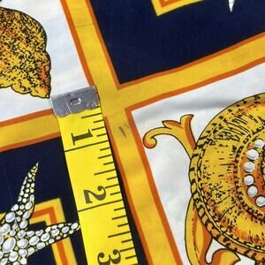 Breezy shorts with a novelty gold and navy seashell design. Slash pockets at hip, with button closure on side of waist. A bit of stretch in the waist thanks to the elastic in back. There are some marks near cuffs, see last pics.