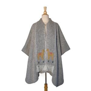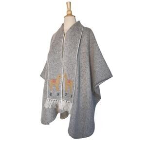 Vintage 80s cape. This is gorgeous!! A true conversation piece. Gray mottled wool cape with built in scarf. Open sides. Incredible embroidered and appliqued alpacas on the scarf. Fringe trim on scarf.