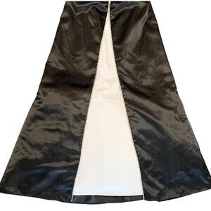 This dramatic vintage 1980s Jump Apparel halter formal gown features a rhinestone-lined, plunging V neckline, open back, ruched bodice, and a sweeping black satin skirt with a white underlay and full crinoline. A rare prom/pageant/showpiece in outstanding condition, worn only once decades ago.