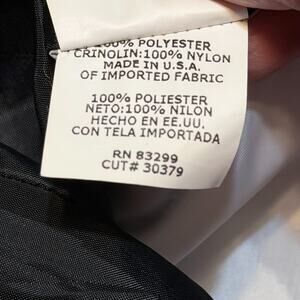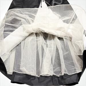 Special features: Rhinestone trim, boning, ruched bodice, layered open-front skirt, dramatic crinoline volume.