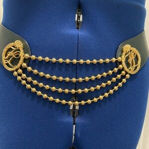 This is a vintage 1980s Karl Lagerfeld belt w green leather and gold-colored beads in excellent condition; made in Paris France.