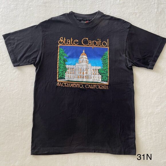 This vintage Keehn Scenes t-shirt is a rare find for any 80s enthusiast. The foil printed design featuring the State Capitol is eye-catching and unique, making it perfect for any season. The shirt is made of comfortable cotton material and has a regular fit, with short sleeves and a crew neckline.