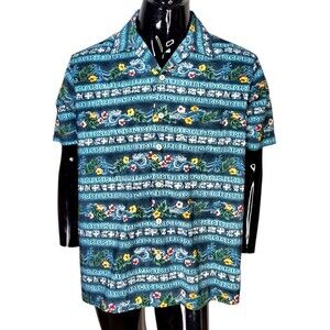 Vintage 80s Kennington striped floral and dragon print, coconut buttons, one pocket at the chest, men's size large,