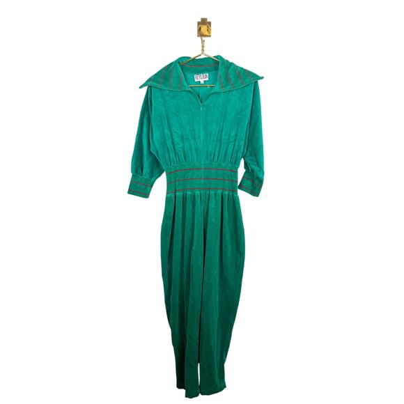 Vintage 80s Keyloun Green Velour Jumpsuit Zip-Up Collar Striped Holiday NWT P