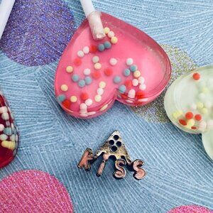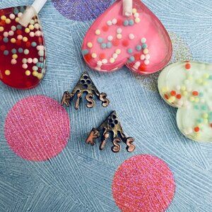 Vintage 1980s earring jackets. This pair spells out "KISS" in pink enamel. The earrings are gold metal. Add a your favorite stud earrings to the jackets for a fun 80s look! Each jacket measures .75" long and wide. There are four hole options on the jacket to align to your preferred style. In good vintage condition.